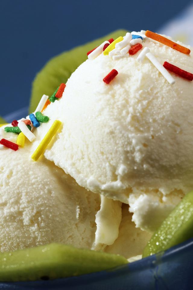 Wallpaper Vanilla ice cream with pieces of kiwi in a blue plate