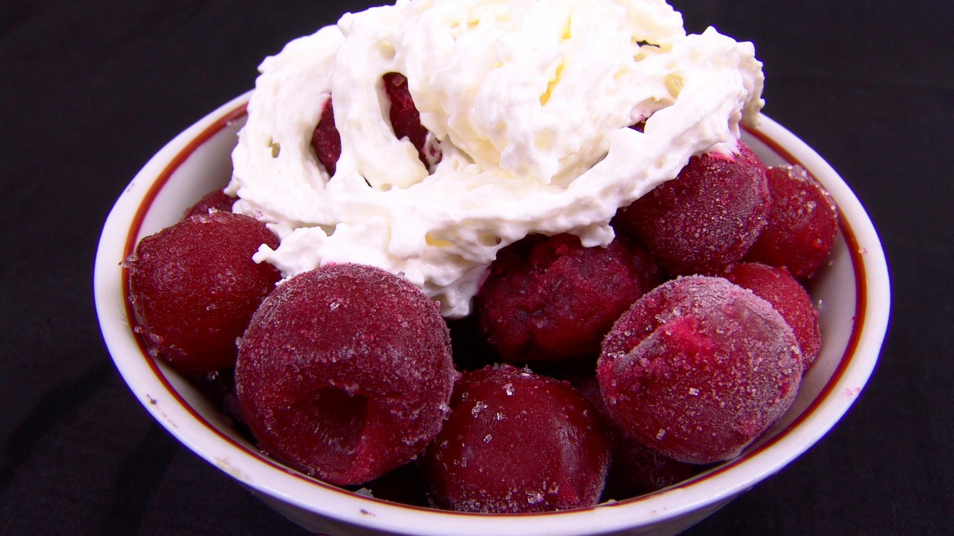 Wallpaper Frozen cherries to a plate with cream