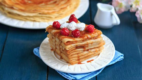 Wallpaper Appetizing delicate pancakes with raspberry and syrup