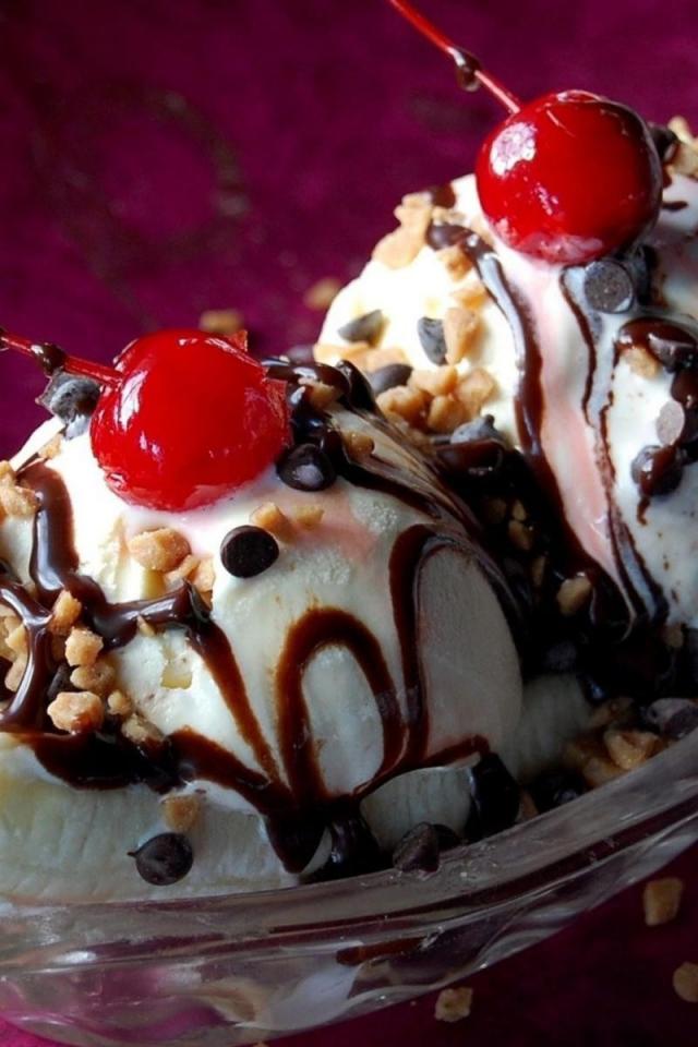 Wallpaper Two balls of ice cream with chocolate and cherry