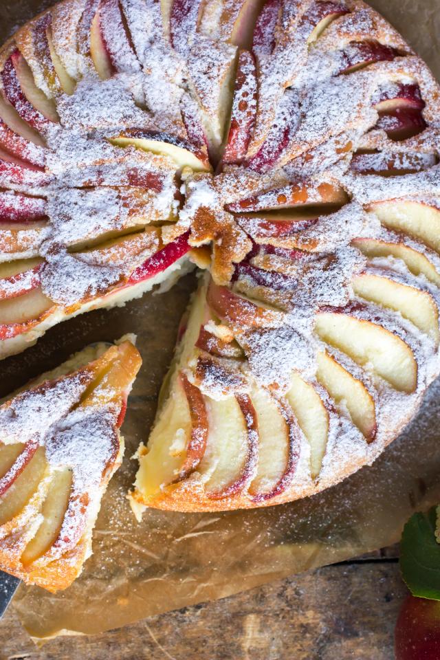 Wallpaper Appetizing pie with red apples and powdered sugar