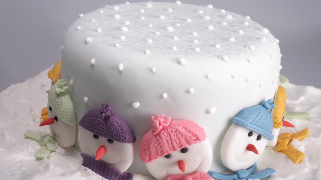 Wallpaper New Year`s cake decorated with snowmen from sugar
