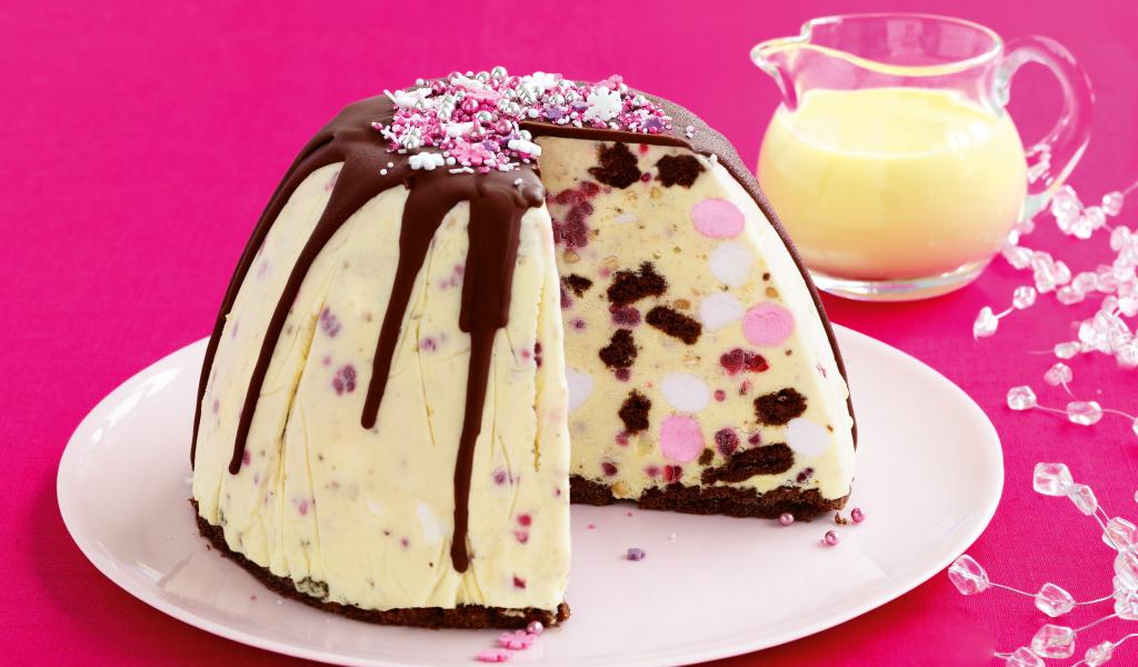 Wallpaper Delicious dessert with chocolate on a pink background