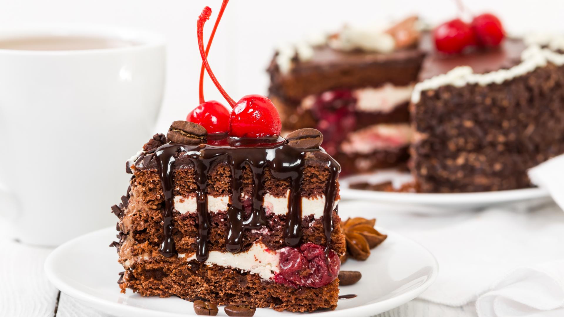 Wallpaper Delicious piece of cake with chocolate and cherries