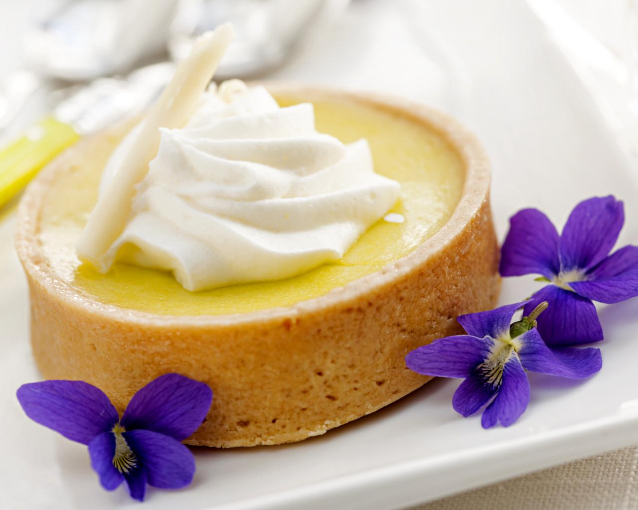 Wallpaper Dessert with cream and purple flowers on a white plate