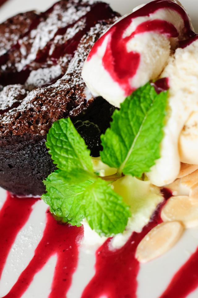 Wallpaper Chocolate cake with ice cream and jam on a plate