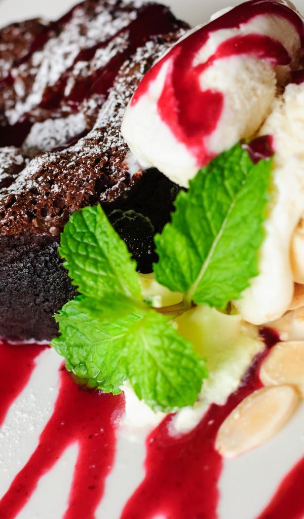 Wallpaper Chocolate cake with ice cream and jam on a plate