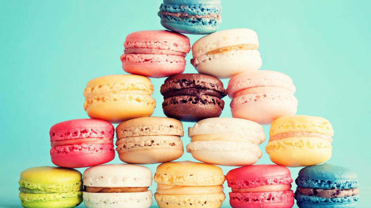 Wallpaper Multicolored macaroon dessert on a blue background with confetti