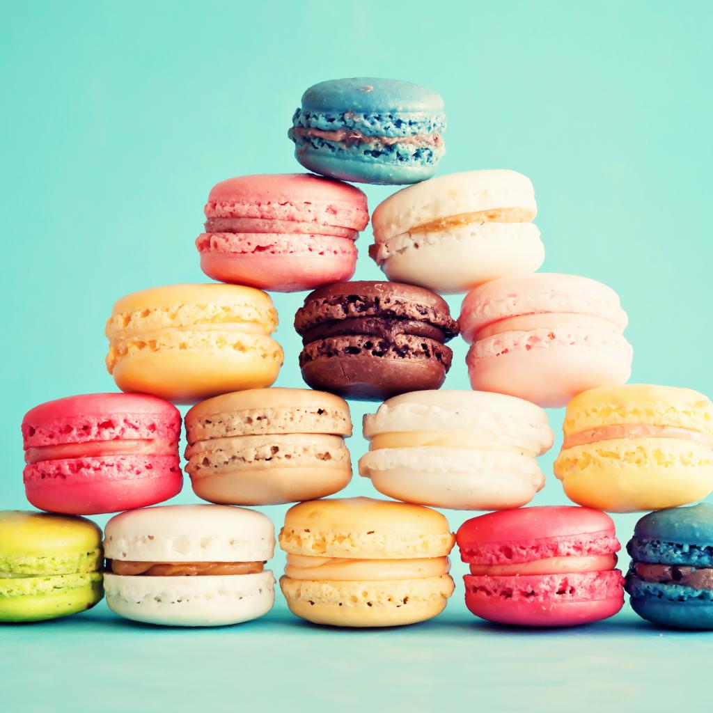 Wallpaper Multicolored macaroon dessert on a blue background with confetti