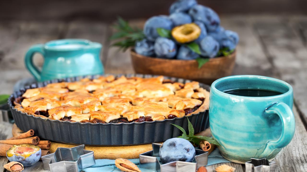 Wallpaper A piece of cake with icing sugar and apricots and plums on a table with tea