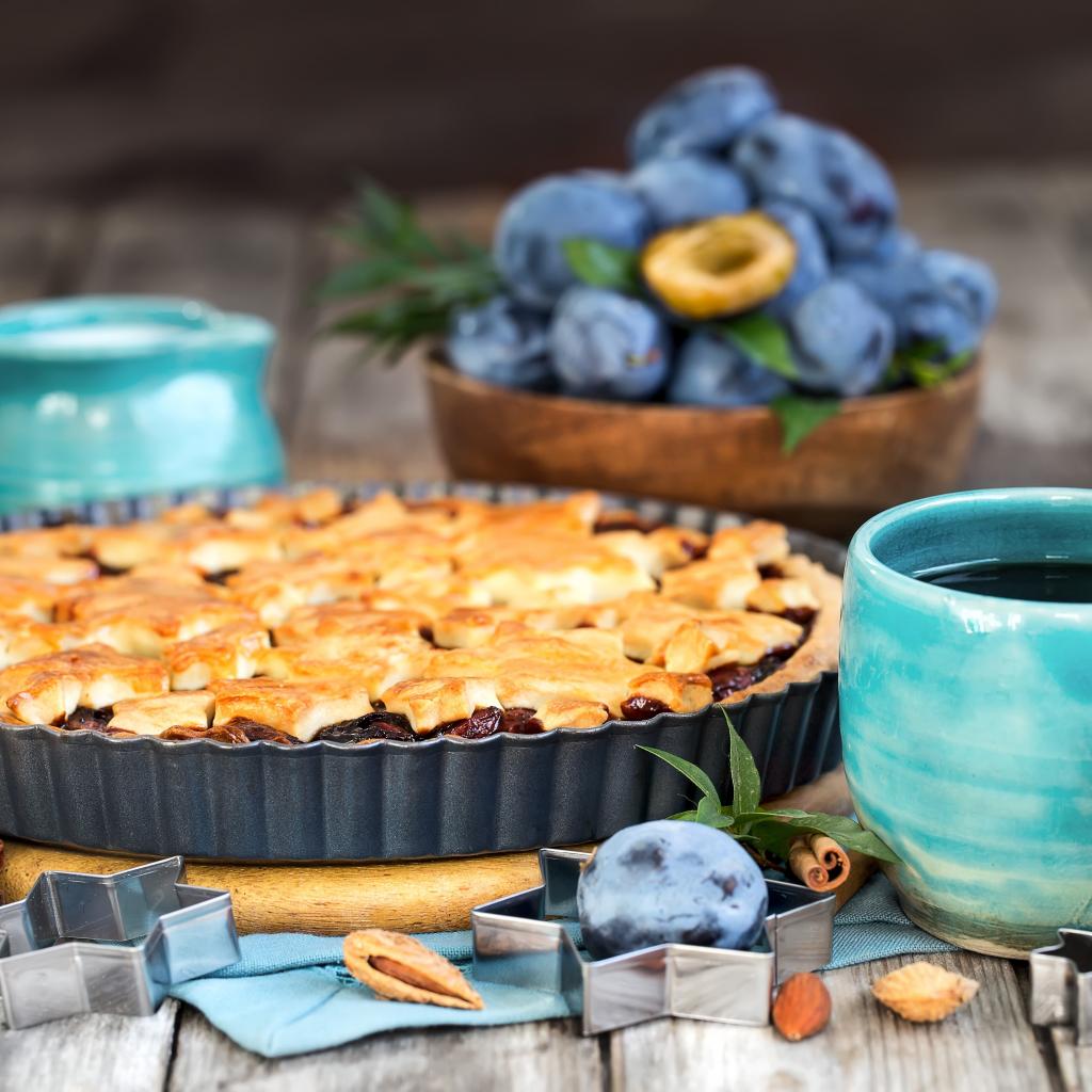 Wallpaper Pie with plums and tea on the table