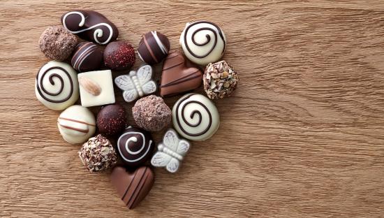 Wallpaper Heart made of chocolates assorted on a wooden table