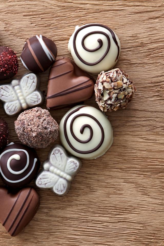 Wallpaper Heart made of chocolates assorted on a wooden table