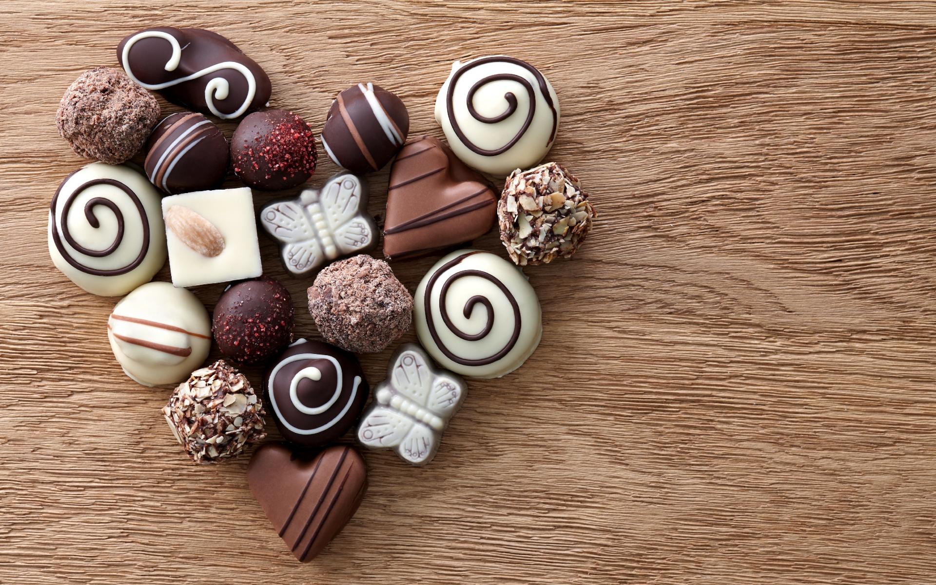 Wallpaper Heart made of chocolates assorted on a wooden table