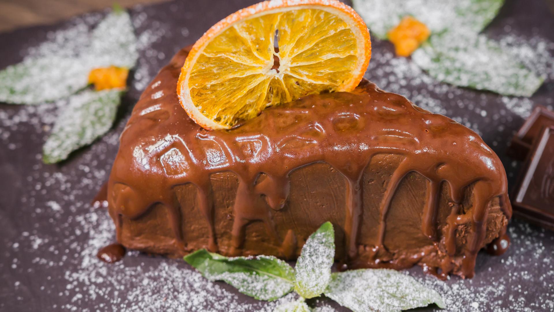 Wallpaper A piece of cake with chocolate and a slice of orange