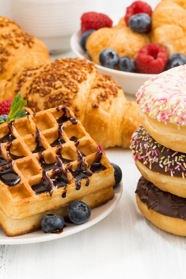 Wallpaper Croissants, waffles and donuts on a table with berries
