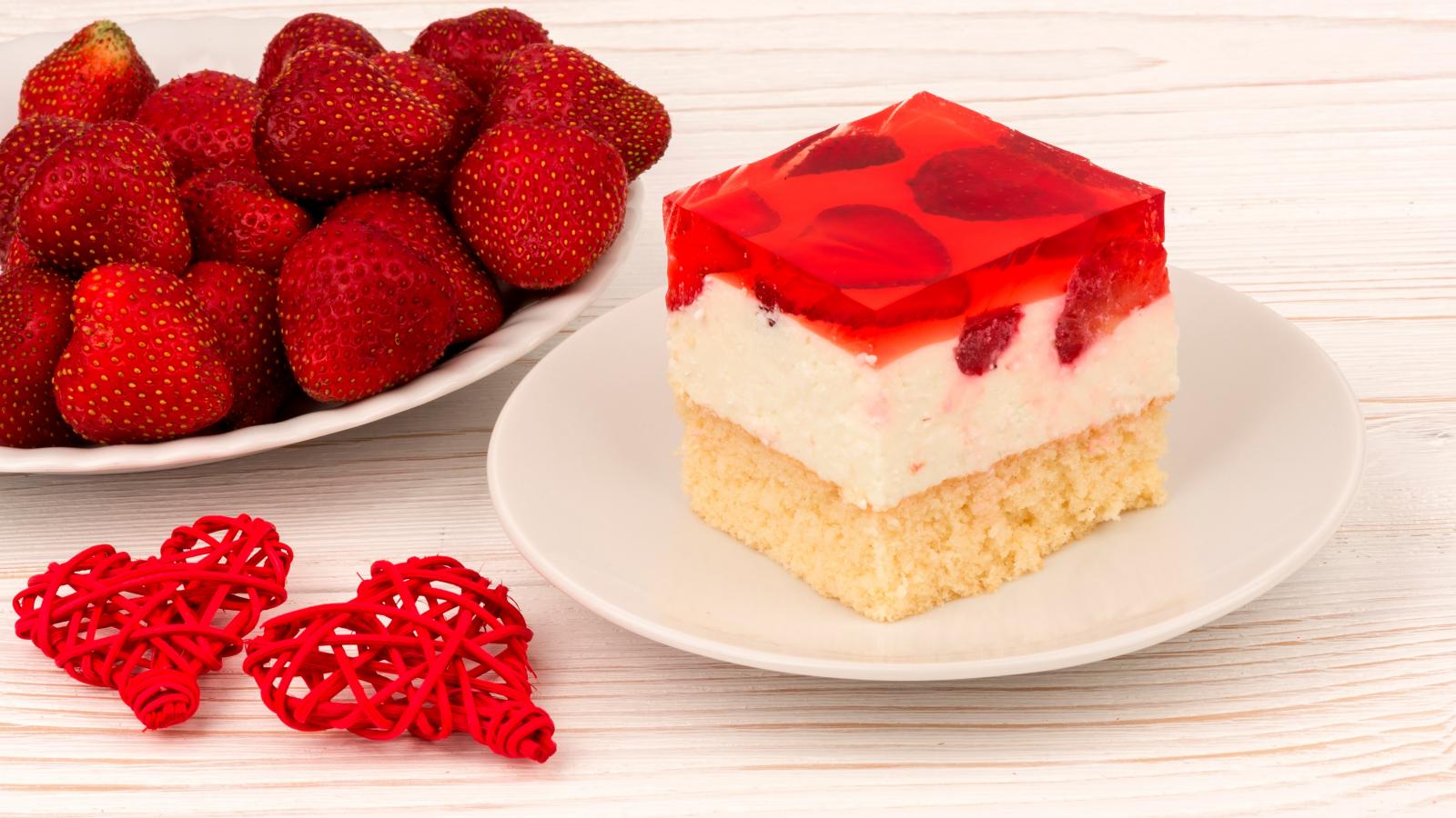 Wallpaper Cake on a table with strawberries and red wicker hearts