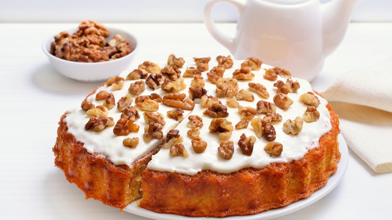 Wallpaper Pie with cream and walnuts on a table with tea