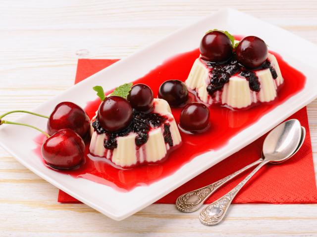 Wallpaper Dessert with jelly and cherries on a plate with syrup