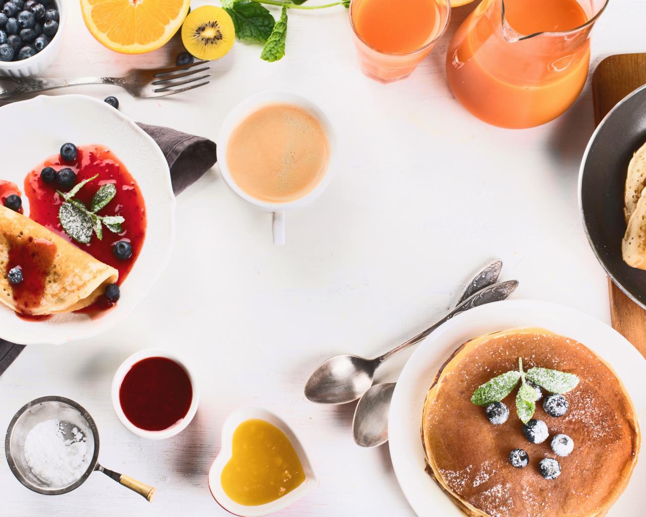 Wallpaper Pancakes with jam and juice on the table for breakfast
