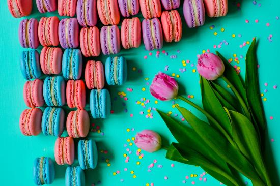 Wallpaper Multicolored desserts macaroons on a table with tulips