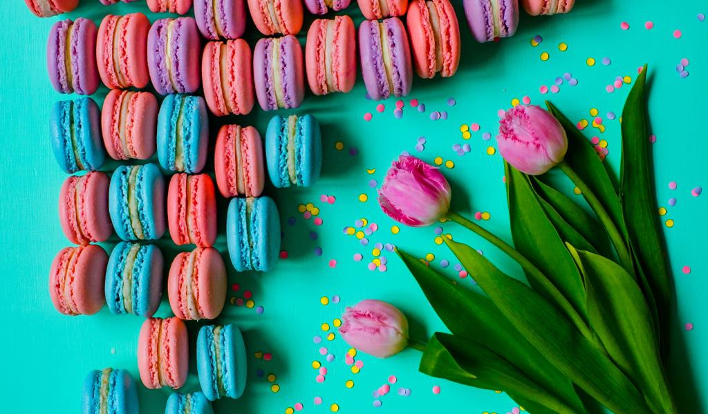 Wallpaper Multicolored desserts macaroons on a table with tulips