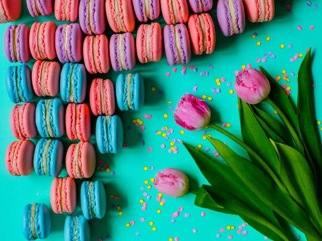 Wallpaper Multicolored desserts macaroons on a table with tulips