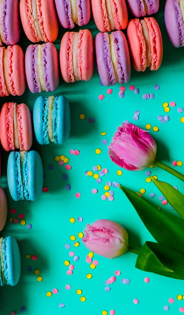 Wallpaper Multicolored desserts macaroons on a table with tulips