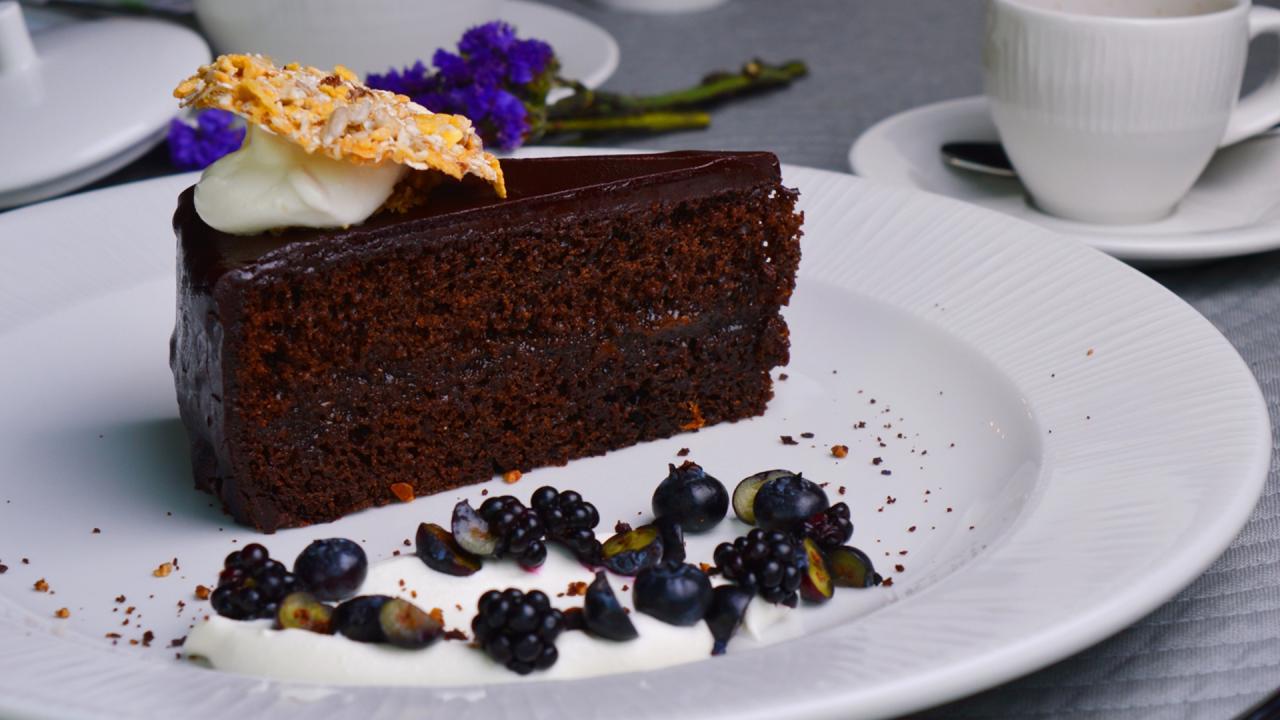 Wallpaper A piece of chocolate cake on a large white plate