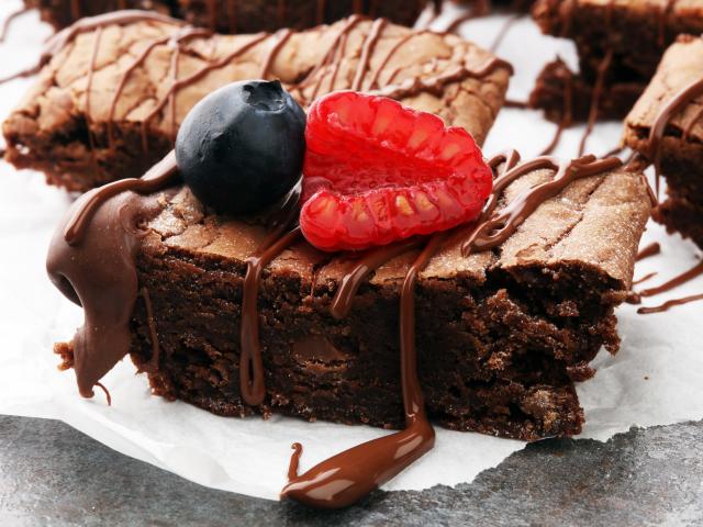 Wallpaper Brownie with chocolate and raspberries and blueberries