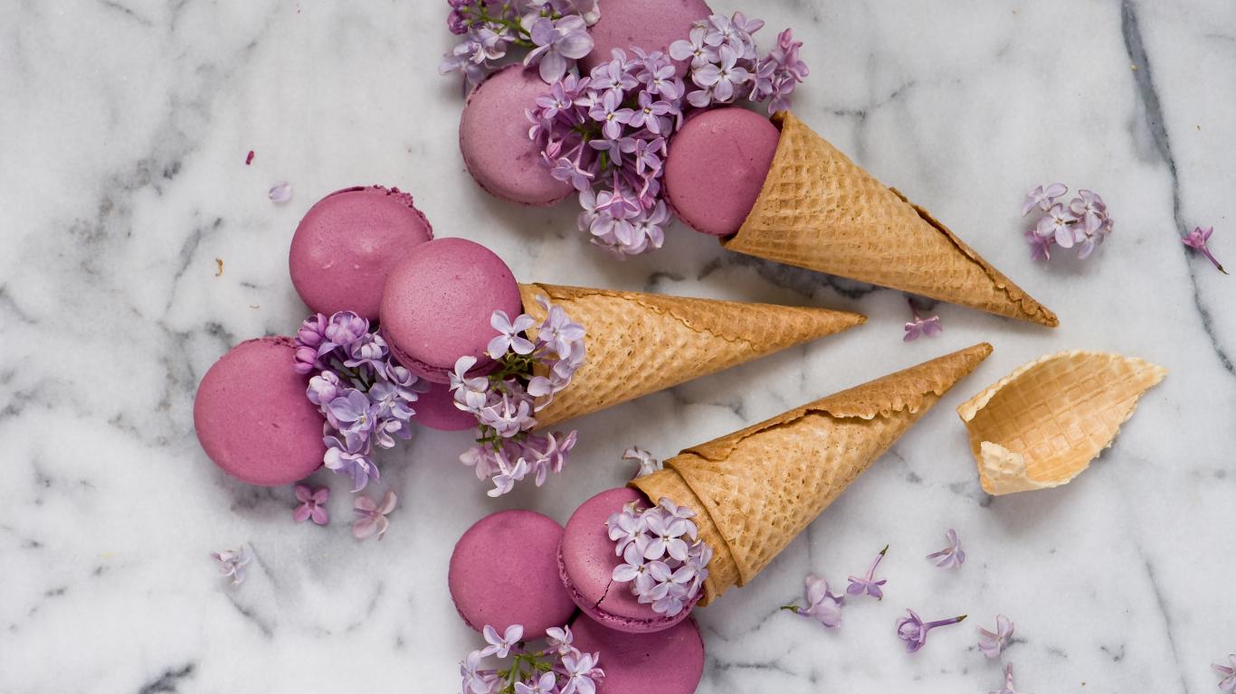 Wallpaper Waffle horns with macaroons and lilac flowers
