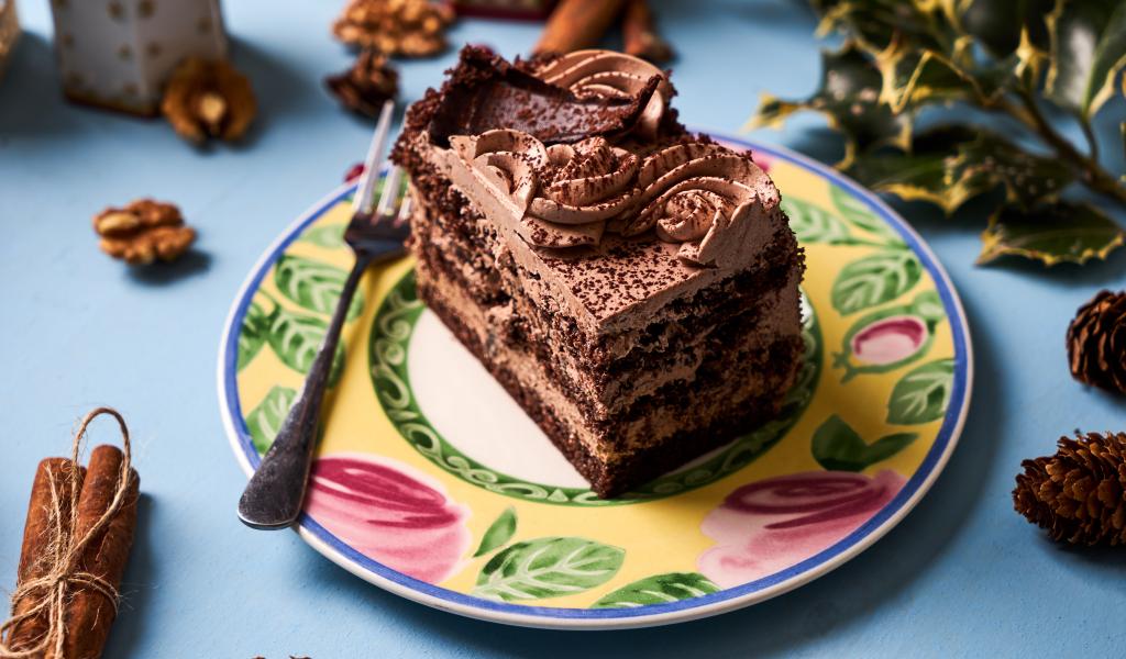 Wallpaper A piece of cake with cream and chocolate on a plate