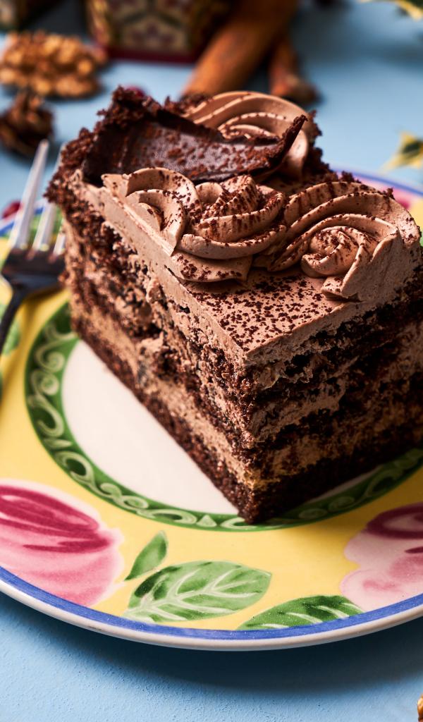 Wallpaper A piece of cake with cream and chocolate on a plate