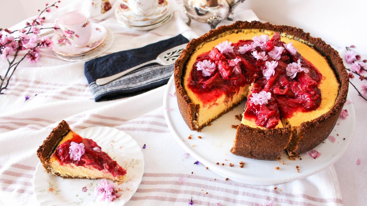 Wallpaper Pieces of cheesecake on a table with jam and raspberries