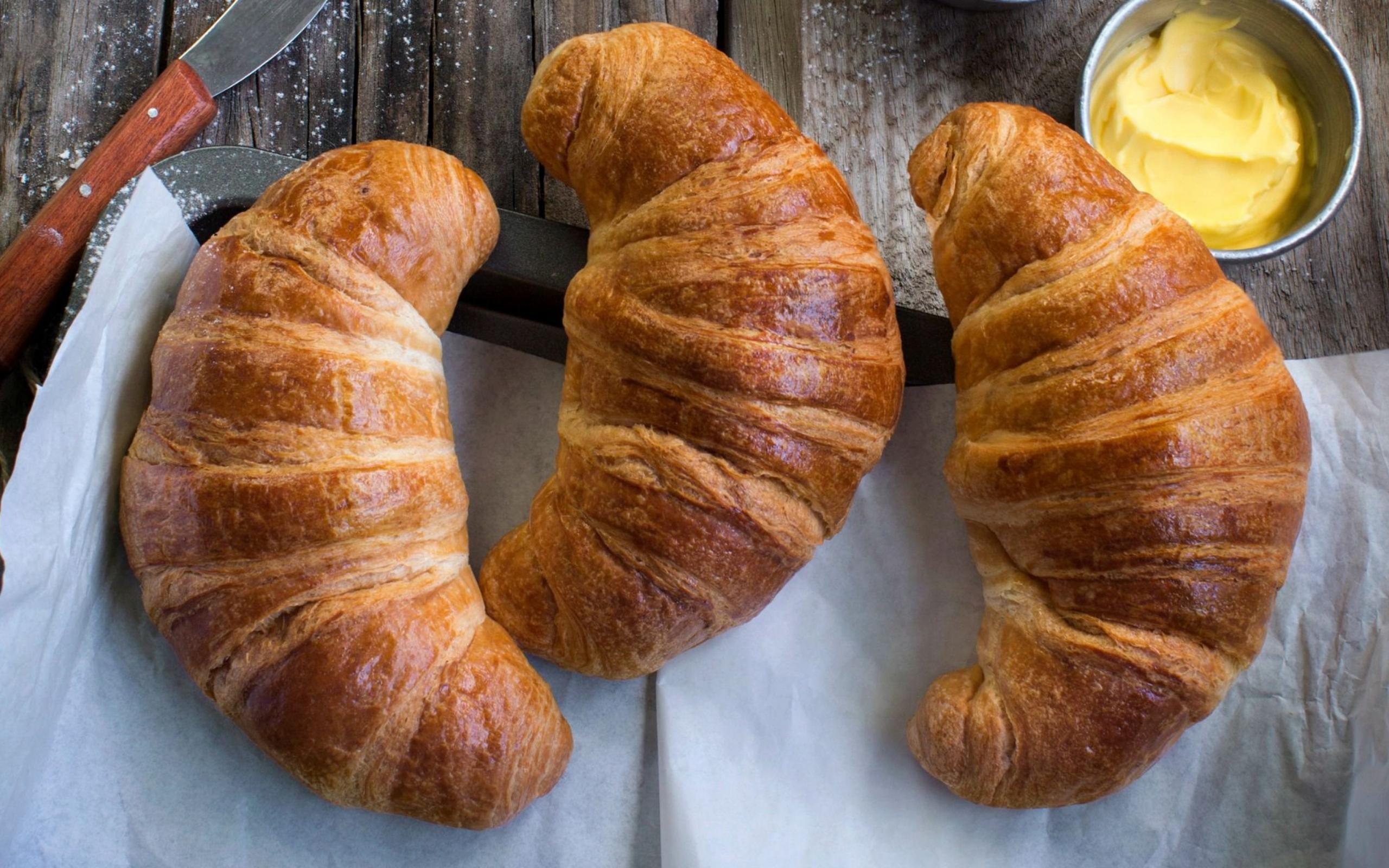 Wallpaper Three fresh croissants on a table with cream