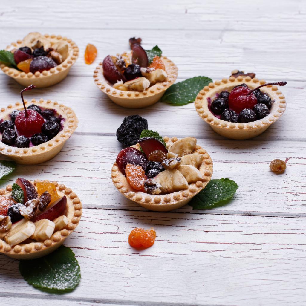 Wallpaper Tartlets with plums, bananas and dried fruits