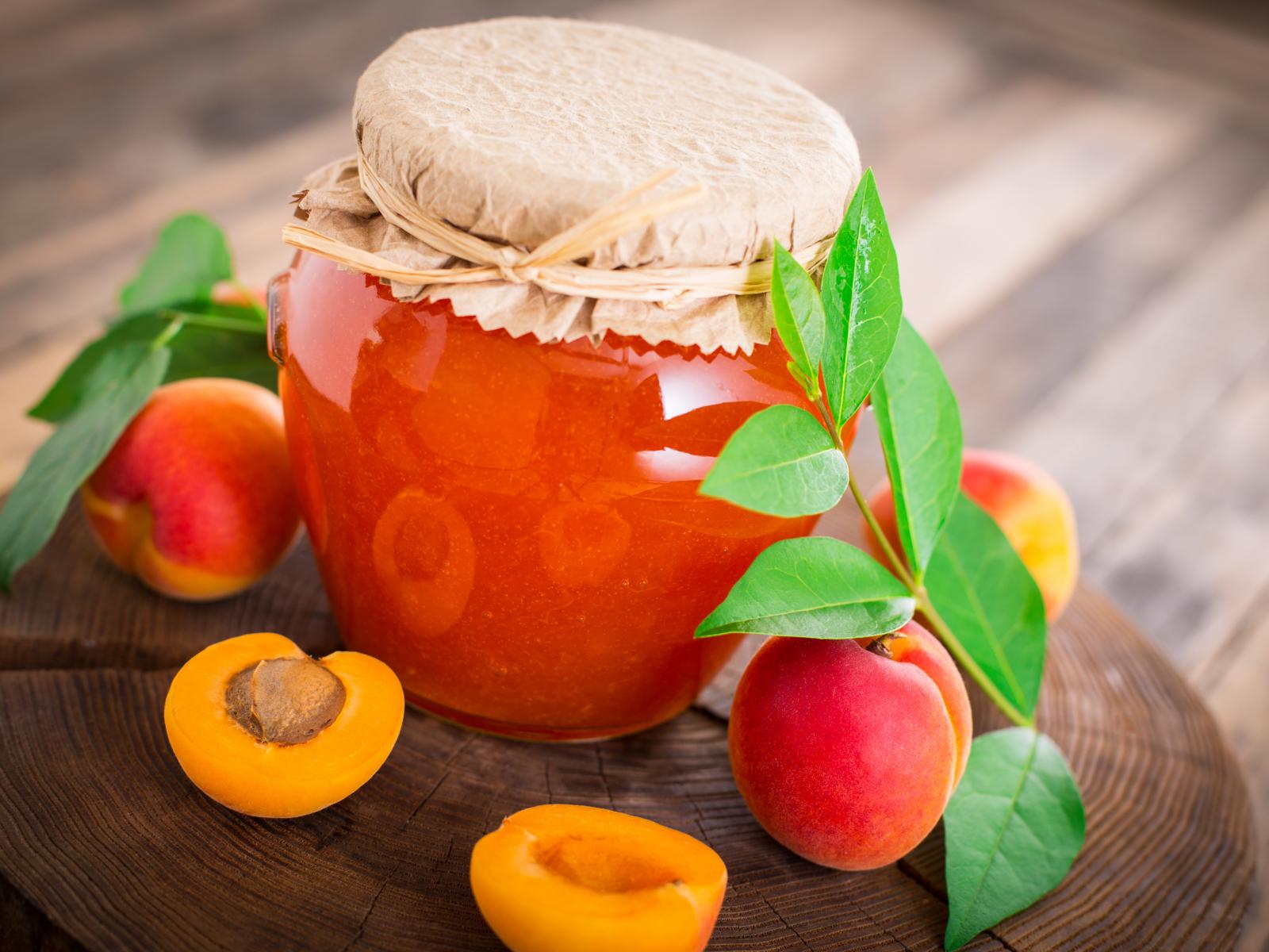 Wallpaper Apricot jam in a jar on a table with apricots