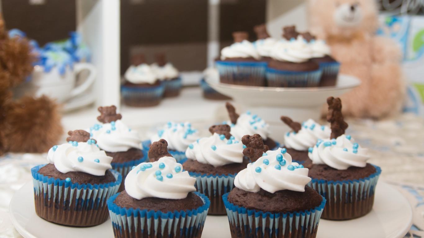 Wallpaper Chocolate muffins with cream and colored sprays on a blue background