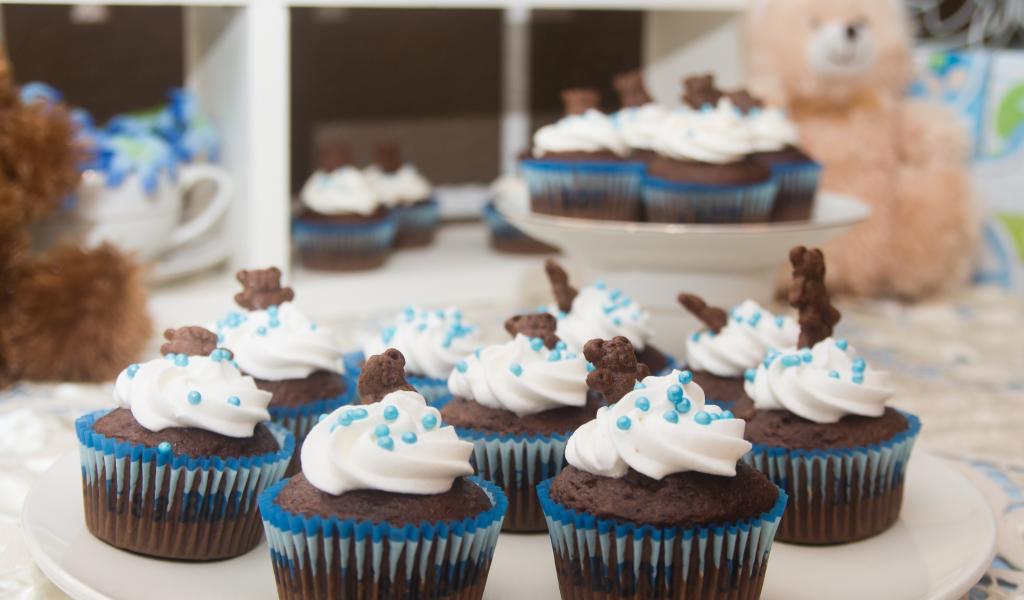 Wallpaper Chocolate muffins with cream and colored sprays on a blue background