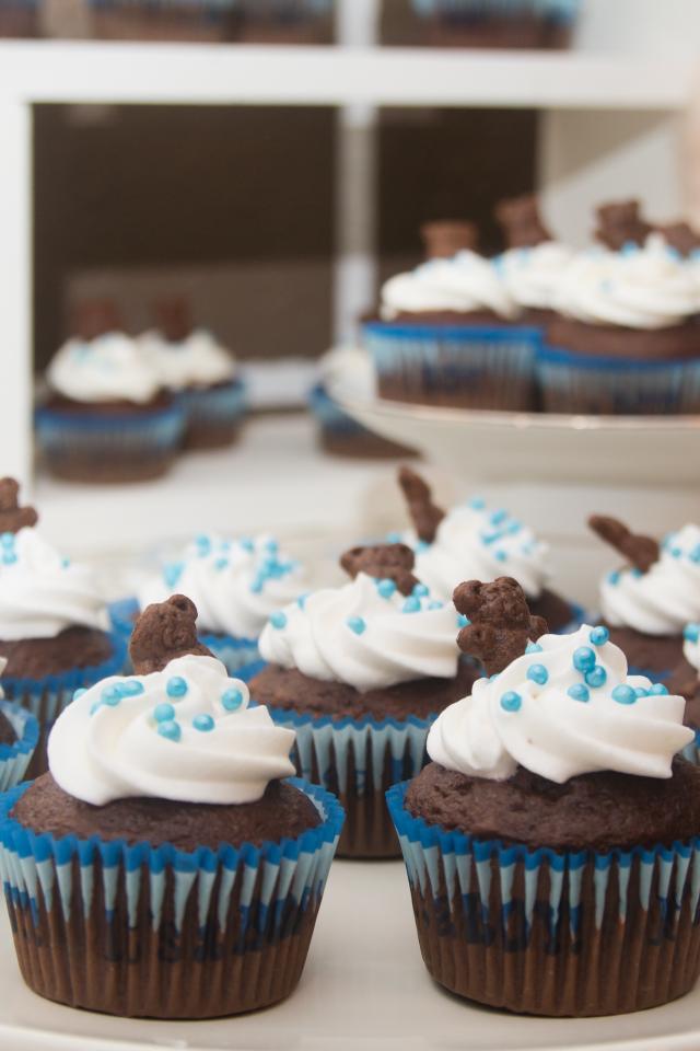 Wallpaper Chocolate muffins with cream and colored sprays on a blue background