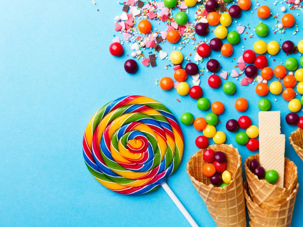 Wallpaper Sweet candy and waffle horns on a blue background