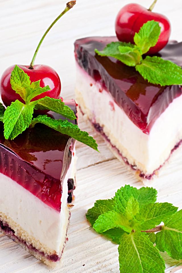 Wallpaper Two appetizing cakes with cherries and fresh mint