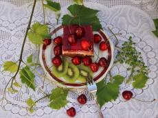 Wallpaper A piece of cake with kiwi and mint on a table with grapes