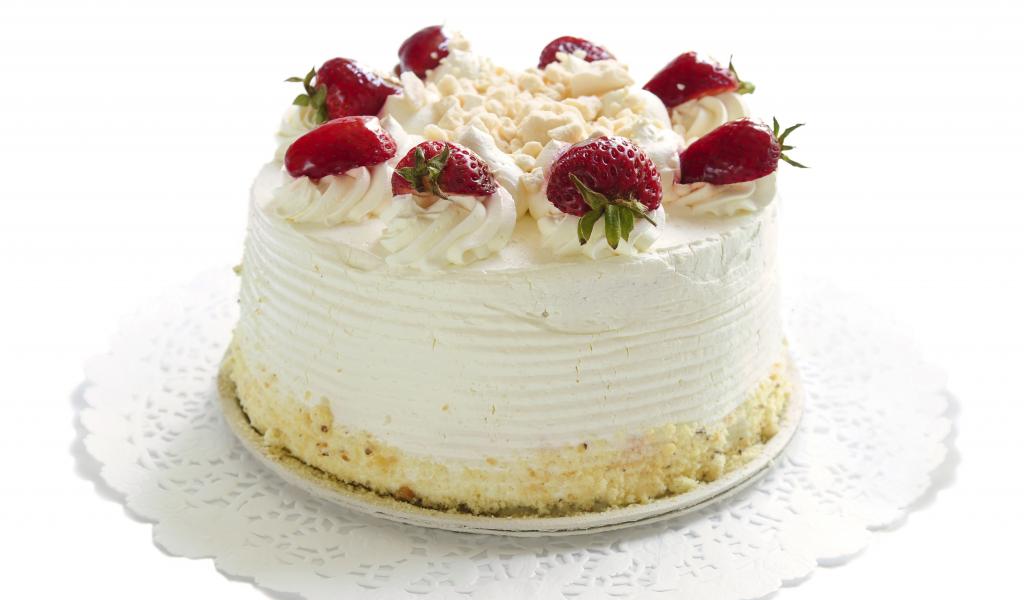 Wallpaper Delicious cake with souffle, white chocolate and strawberries on white background