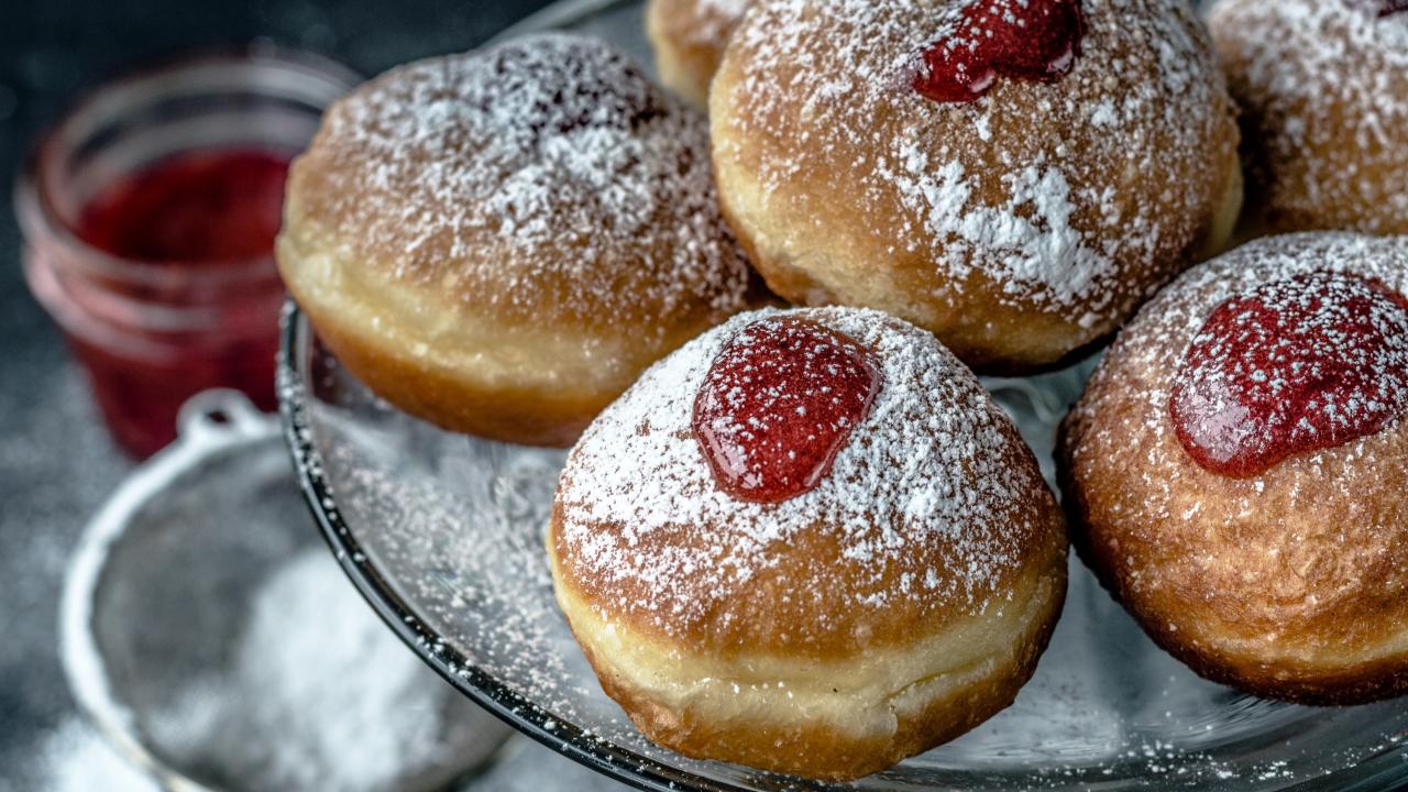 Wallpaper Donuts with jam and powdered sugar on a dish