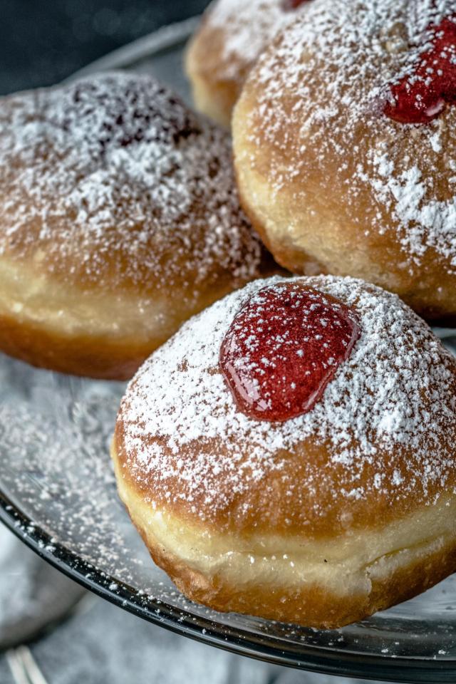 Wallpaper Donuts with jam and powdered sugar on a dish