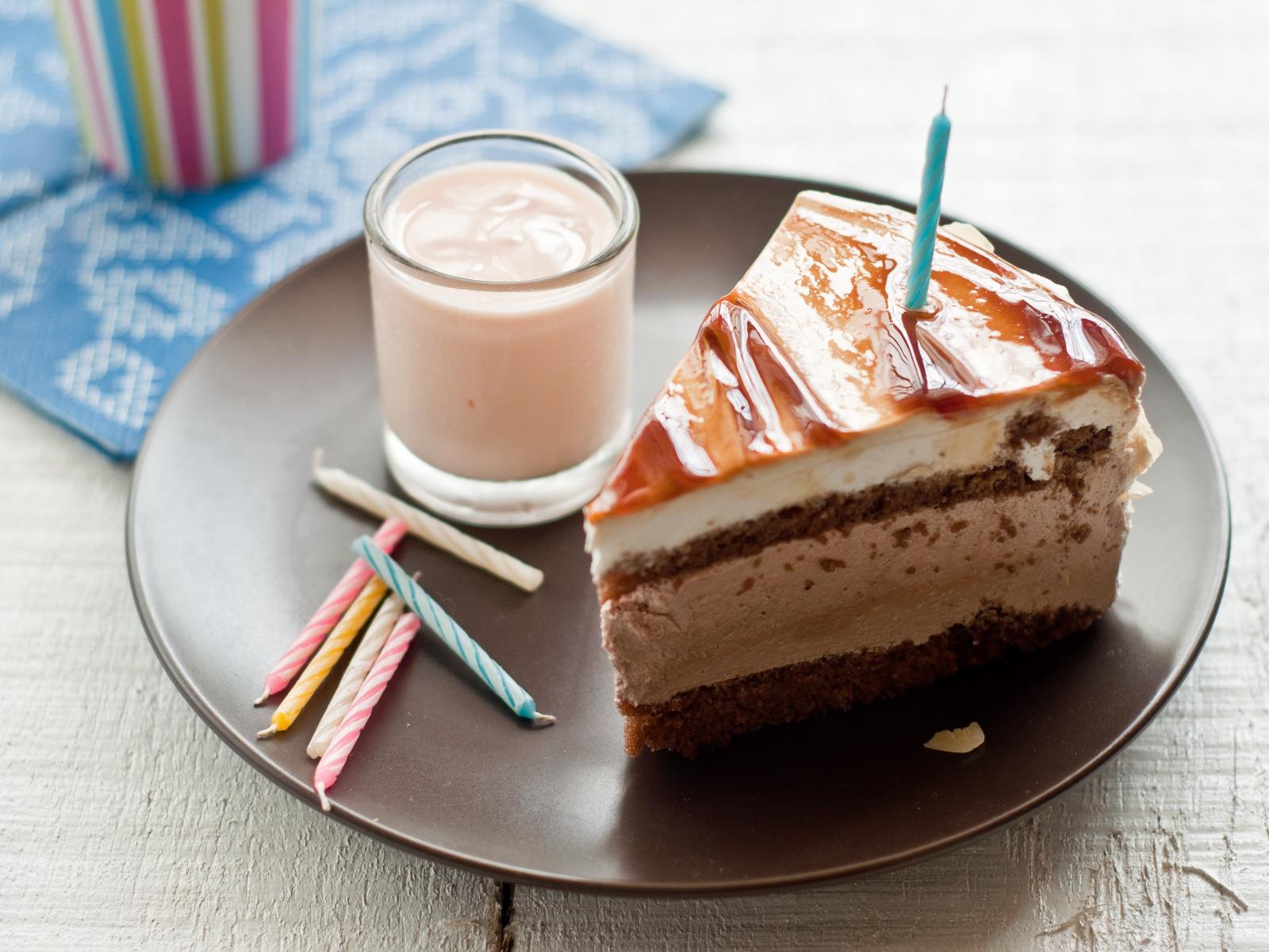 Wallpaper A piece of festive cake with a candle on a plate