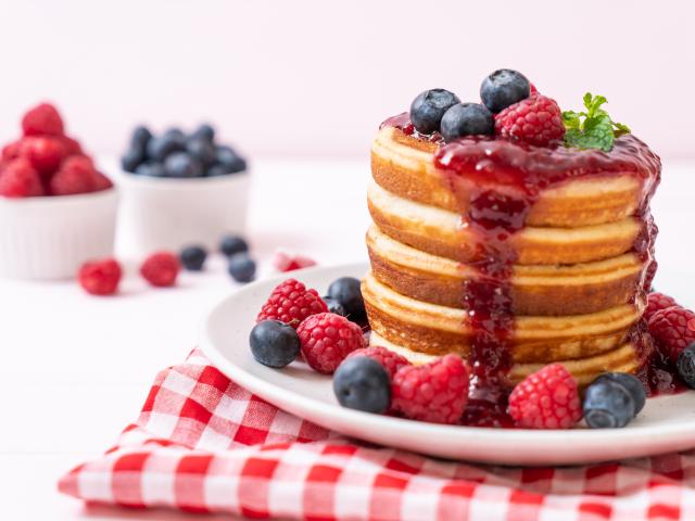 Wallpaper Pancakes with raspberry and blueberry jam and berries