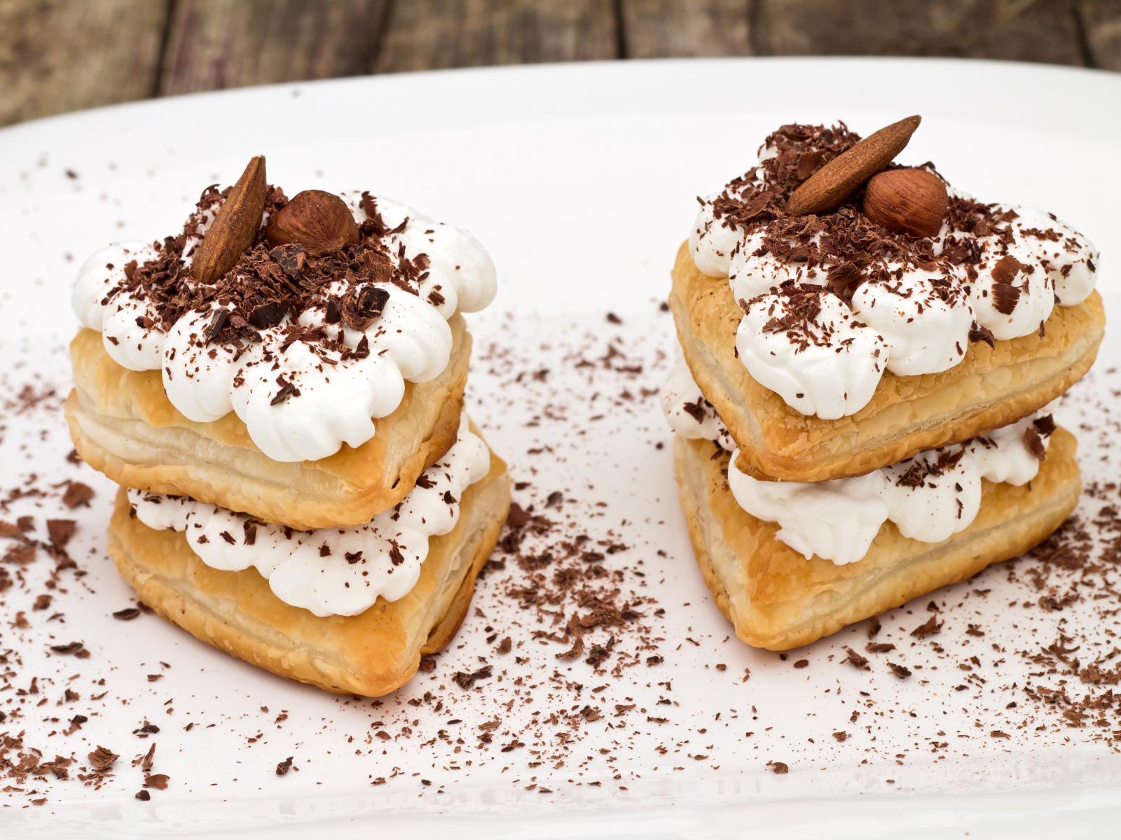 Wallpaper Puff pastry with cream, grated chocolate and nuts