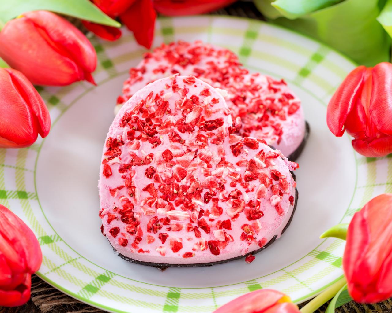 Wallpaper Two heart-shaped cookies on a plate with tulips